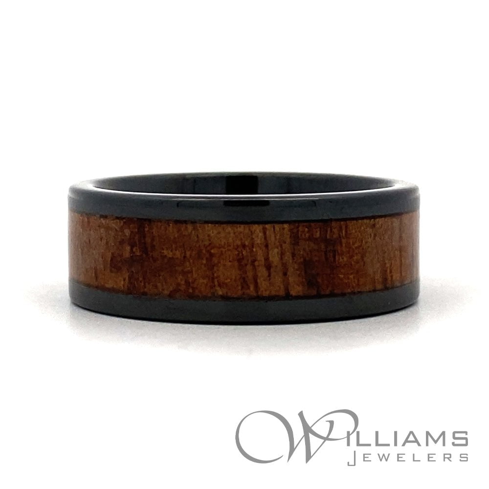Heavy Stone Black Ceramic 8mm Flat Koa Wood Inlay Wedding Band, Size 10