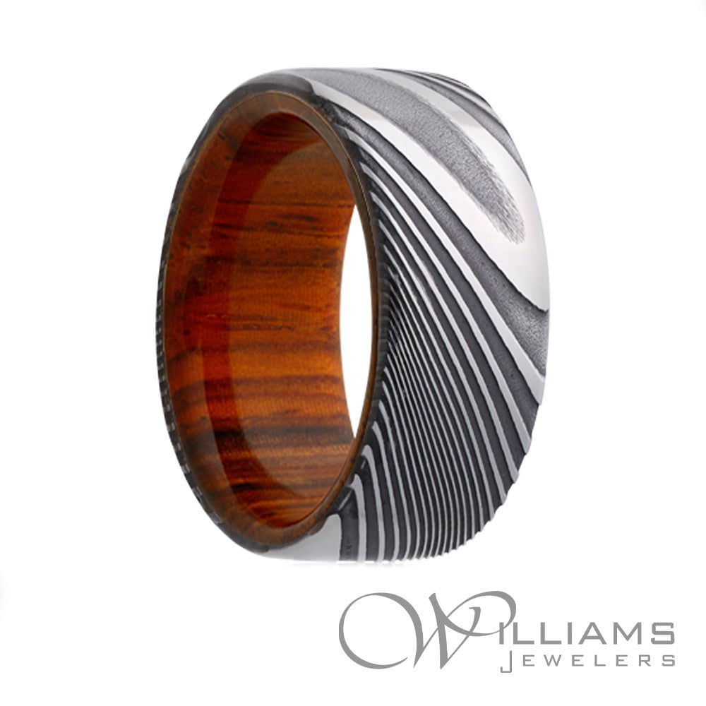 Heavy Stone Damascus Steel 8mm Twisted Flat High Polish with Whiskey Barrel Wood Interior Wedding Band. Size 10