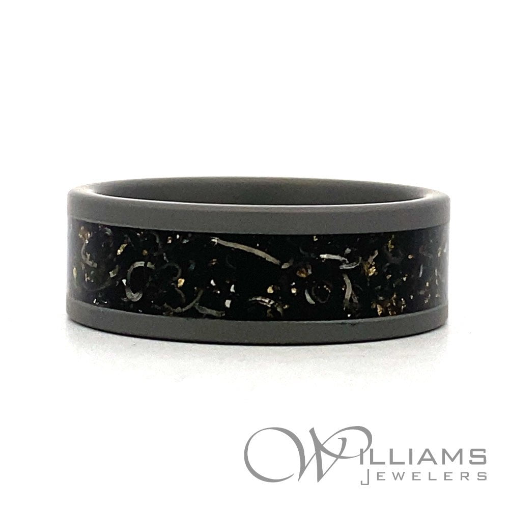 Heavy Stone Tungsten Carbide 8mm Flat Matt with Black Sand, Meteorite, and Gold Leaflet Center Inlay Wedding Band. Size 10