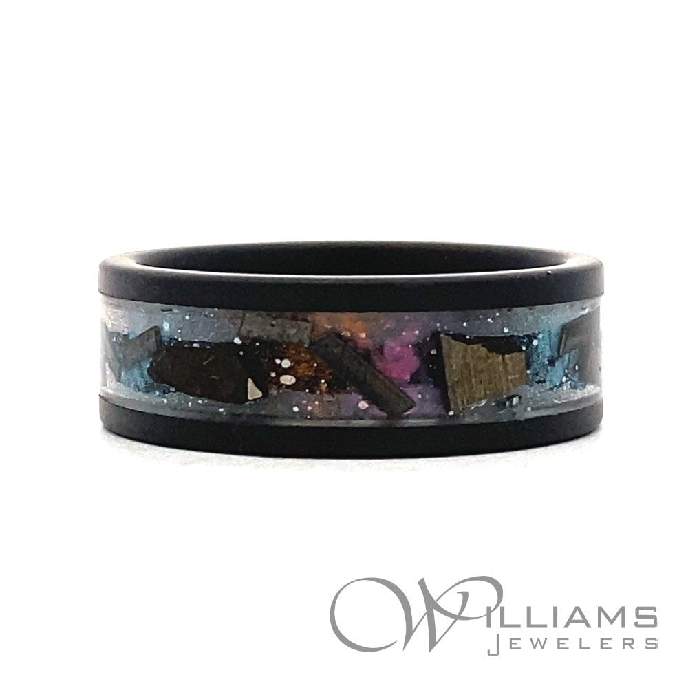 Heavy Stone Black Ceramic 8mm Flat Matt with Meteorite Chucks and Galaxy Cerakote Inlay Wedding Band. Size 10