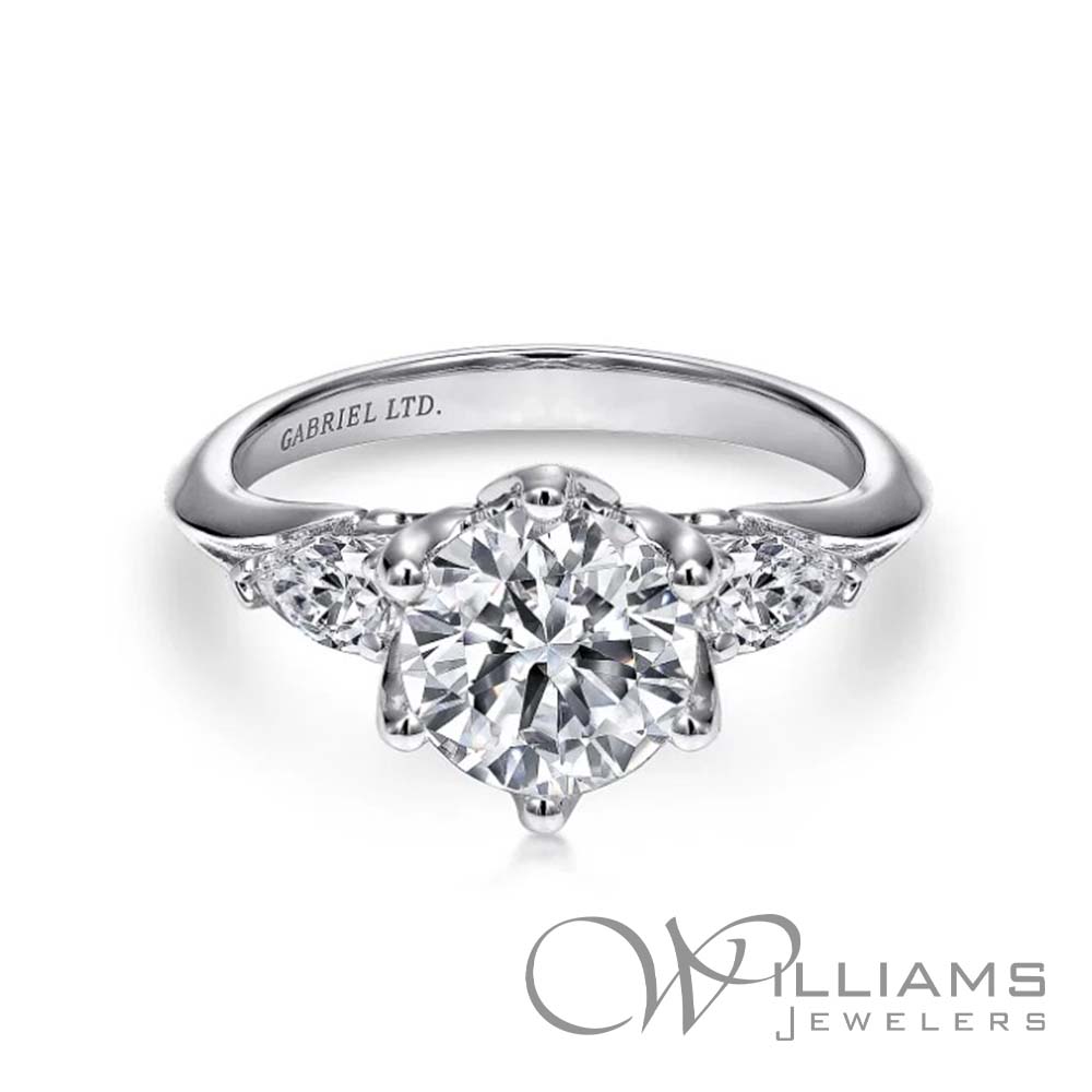 Gabriel & Co. 18 Karat White Gold Contemporary Three Stone Round Diamond Semi Mount Engagement Ring with 2=.41 Carat Total Weight Pear Cut G-H Color, SI2 Clarity Diamonds (GIA Cert) and a center 8.7mm (2.50 Carat) Round Cubic Zirconia, Size 6.5, Serial # S1708374