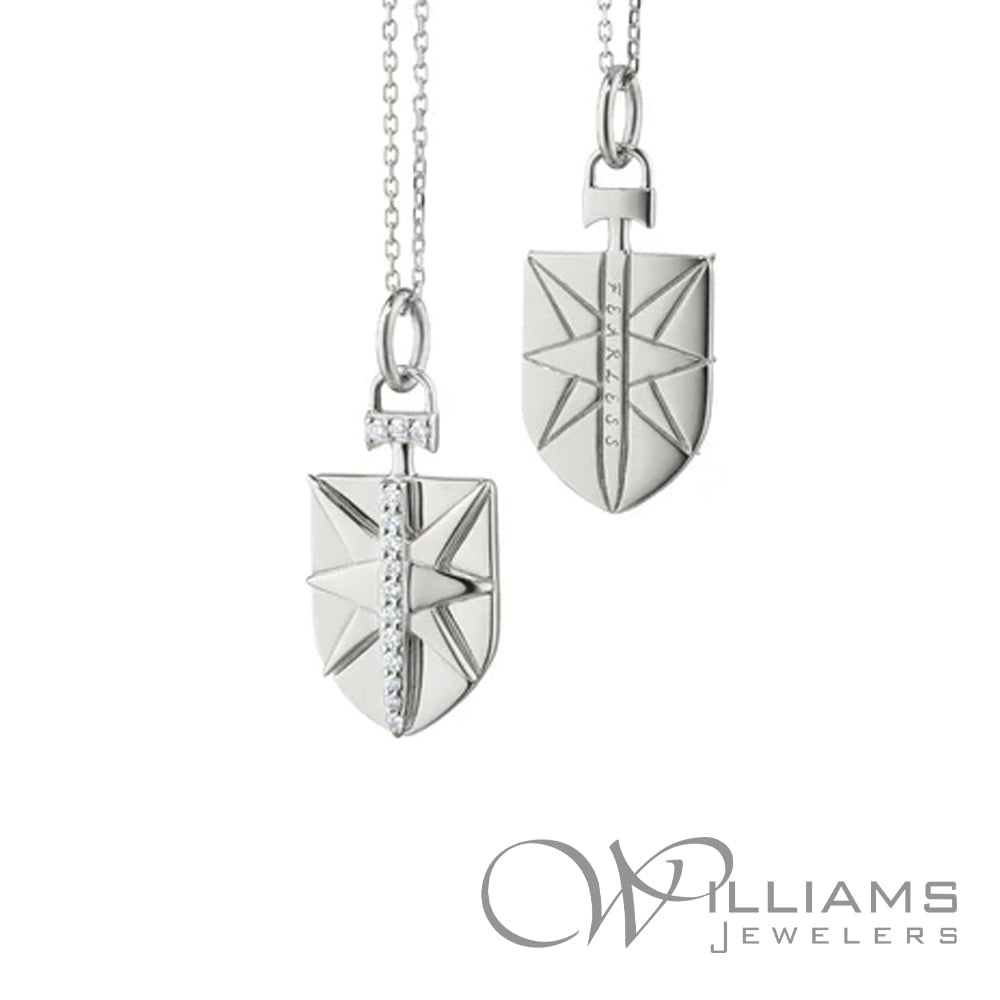 Monica Rich Kosann Sterling Silver "Fearless" White Sapphire Mini Shield Charm with .12 Carat Total Weight Round White Sapphires