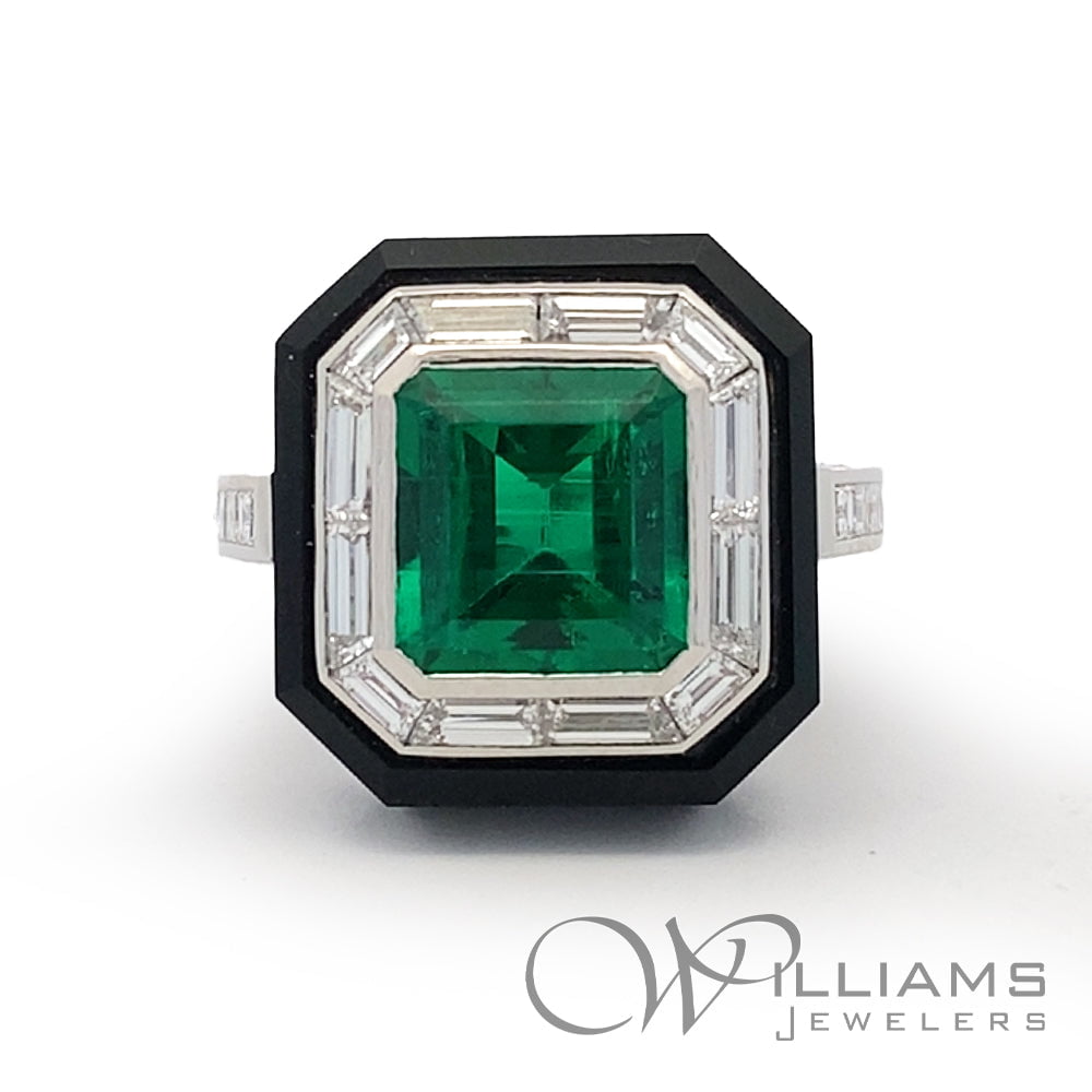 Cicada Platinum Emerald and Diamond Ring with a center 3.07 Carat Emerald-Cut Emerald (AGL# 1142947) and 1.72 Carat Total Weight Baguette E-F Color, VVS Clarity Diamonds, Size 6