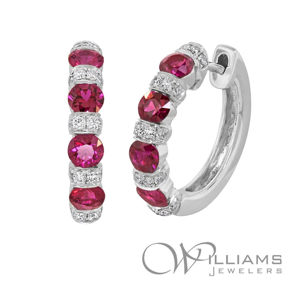 Williams Signature 18 Karat White Gold Ruby & Diamond Hoop Earrings with 8=1.04 Carat Total Weight Round Ruby and 10=.26 Carat Total Weight Round G-H Color, VS Clarity Diamonds.