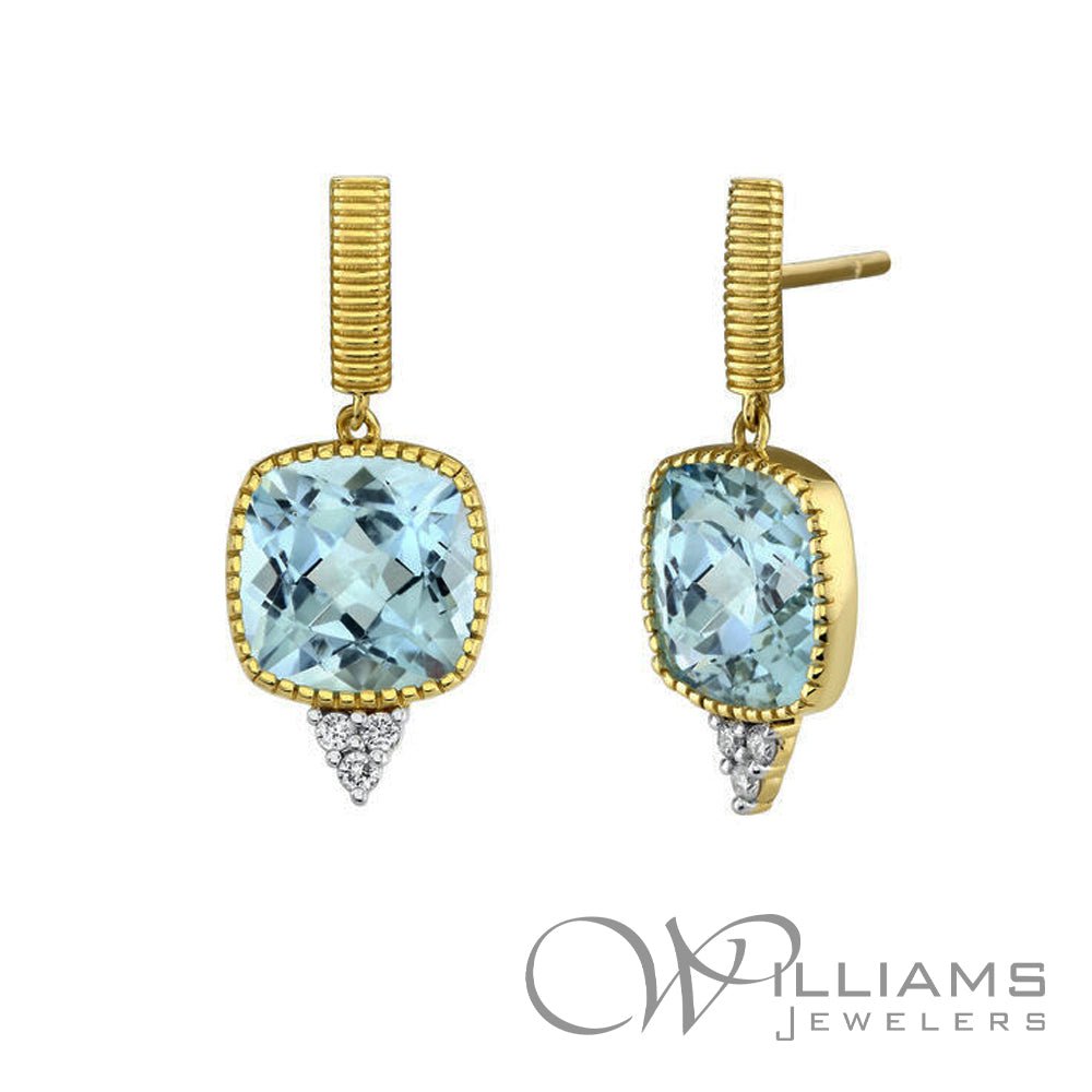 Sloane Street 18 Karat Yellow Gold Cushion Sky Blue Topaz and Diamond Earrings with 2=7.43 Carat Total Weight Cushion Sky Blue Topaz and 6=.09 Carat Total Weight Round G Color, SI Clarity Diamonds
