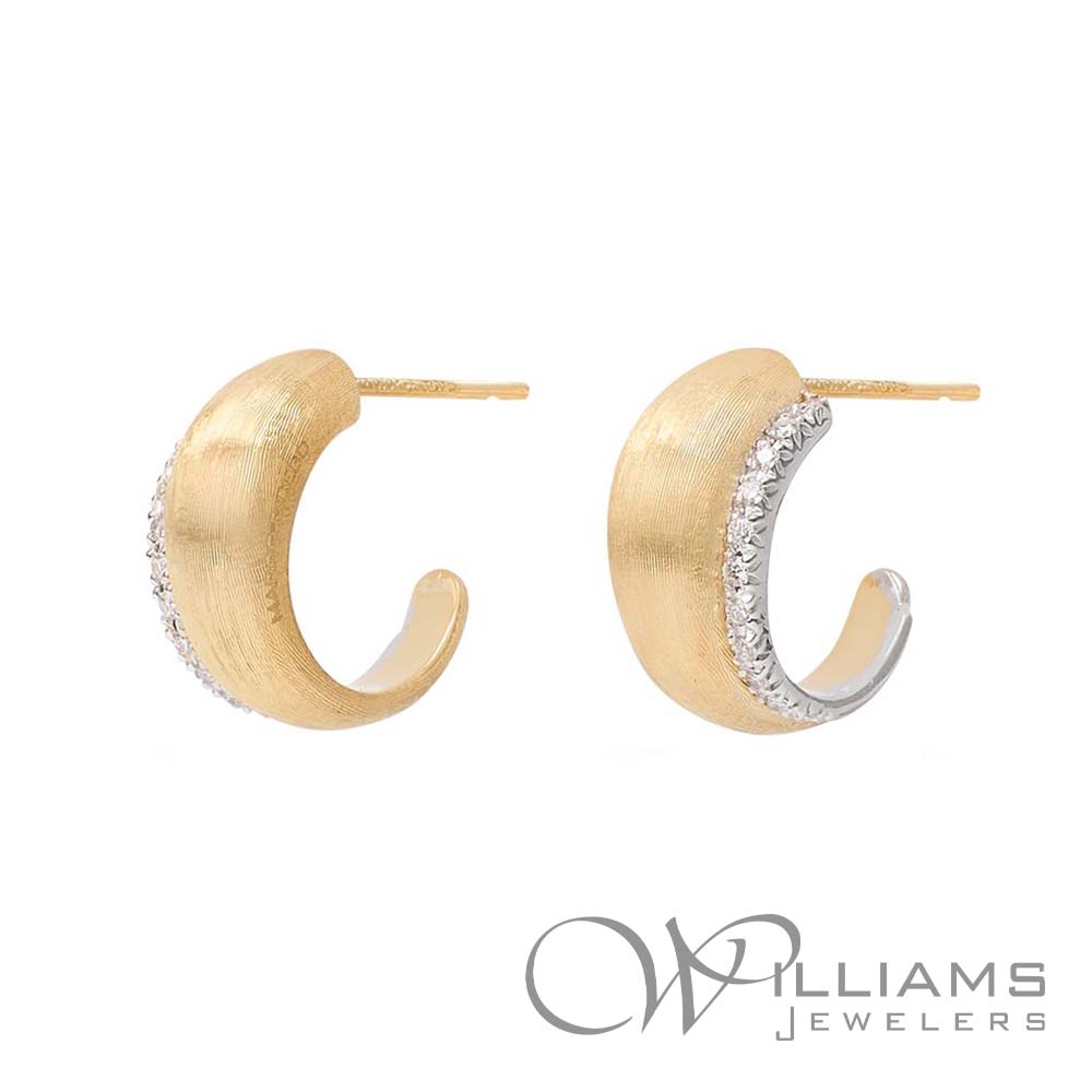 Marco Bicego 18 Karat Yellow & White Gold Lucia Diamond Small Hoop Earrings with .17 Carat Total Weight Round F-G Color, VVS-VS Clarity Diamonds.