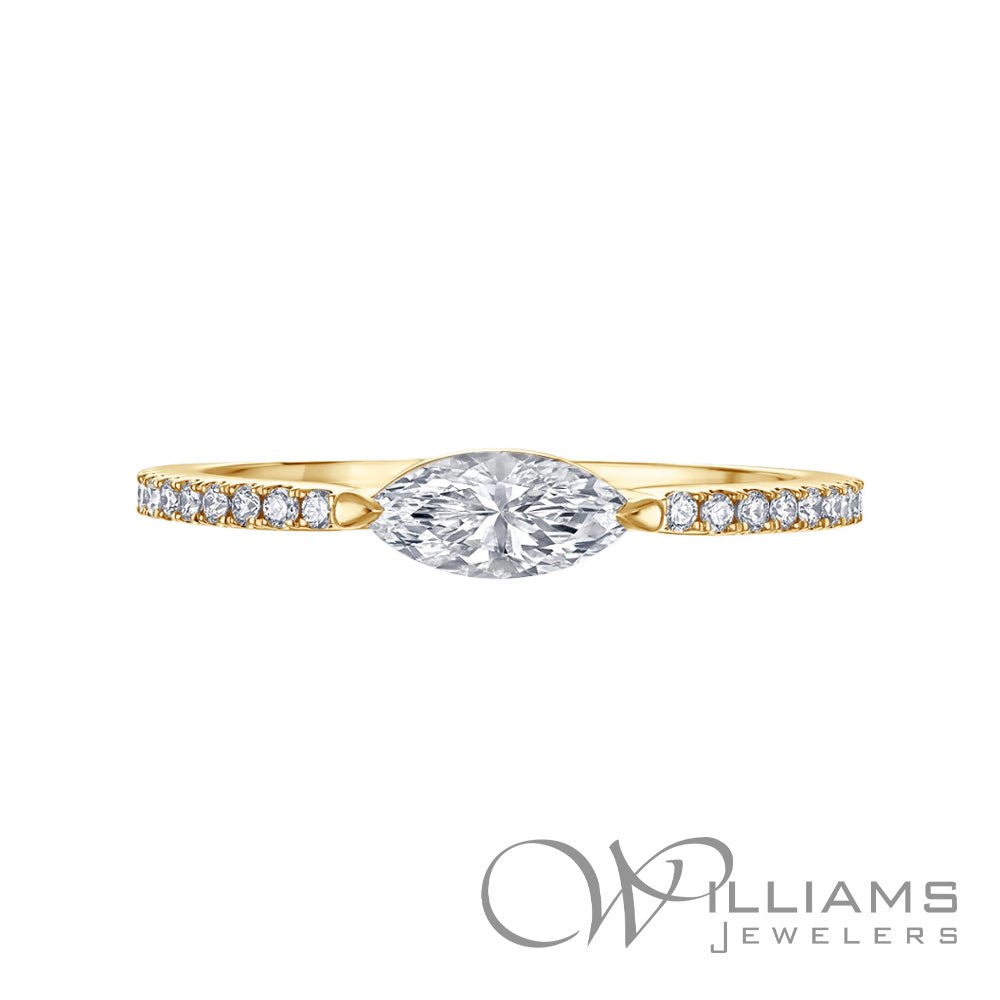 Williams Signature 18 Karat Yellow Gold East West Set Marquise Diamond Ring with a center .30 Carat Marquise G-H Color, SI Clarity Diamond and 30=.18 Carat Total Weight Round G-H Color, SI Clarity Diamonds, Size 6