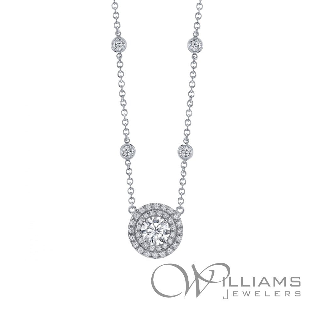 Williams Signature 18 Karat White Gold Diamond Double Halo Pendant with a center 1.01 Carat Round H Color, VVS2 Clarity Diamond (GIA# 2221907147) and 43=.43 Carat Total Weight G-H Color, VS Clarity Diamonds on a Diamond Station Chain with 8=.71 Carat Total Weight G-H Color, VS Clarity Diamonds, 16 inches in length