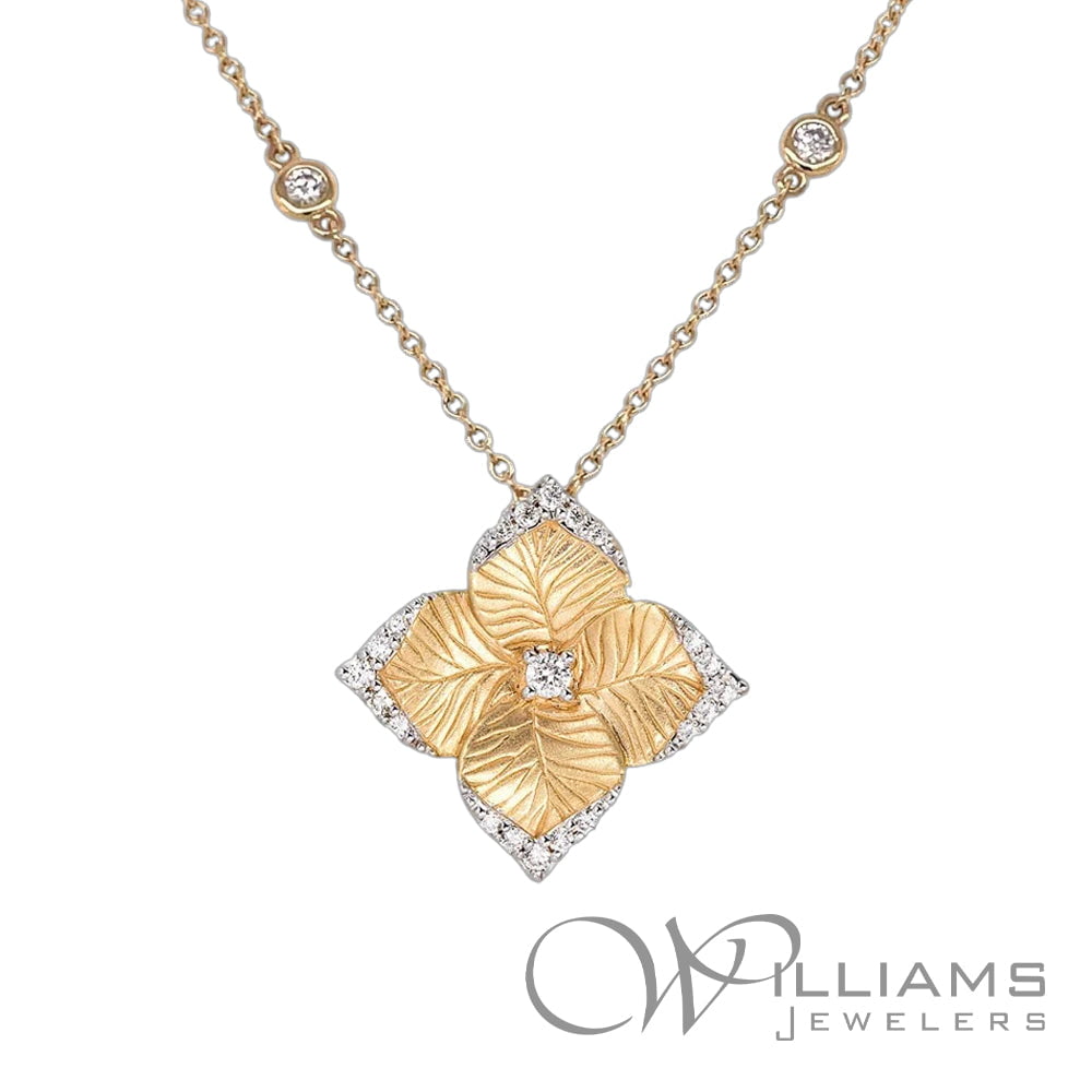 Piranesi 18 Karat Yellow Gold Oro Fiore Diamond Satin Large Flower Pendant on Diamond Station Chain with .63 Carat Total Weight Round G-H Color, VS-SI Clarity Diamonds, 17.75 inches in length