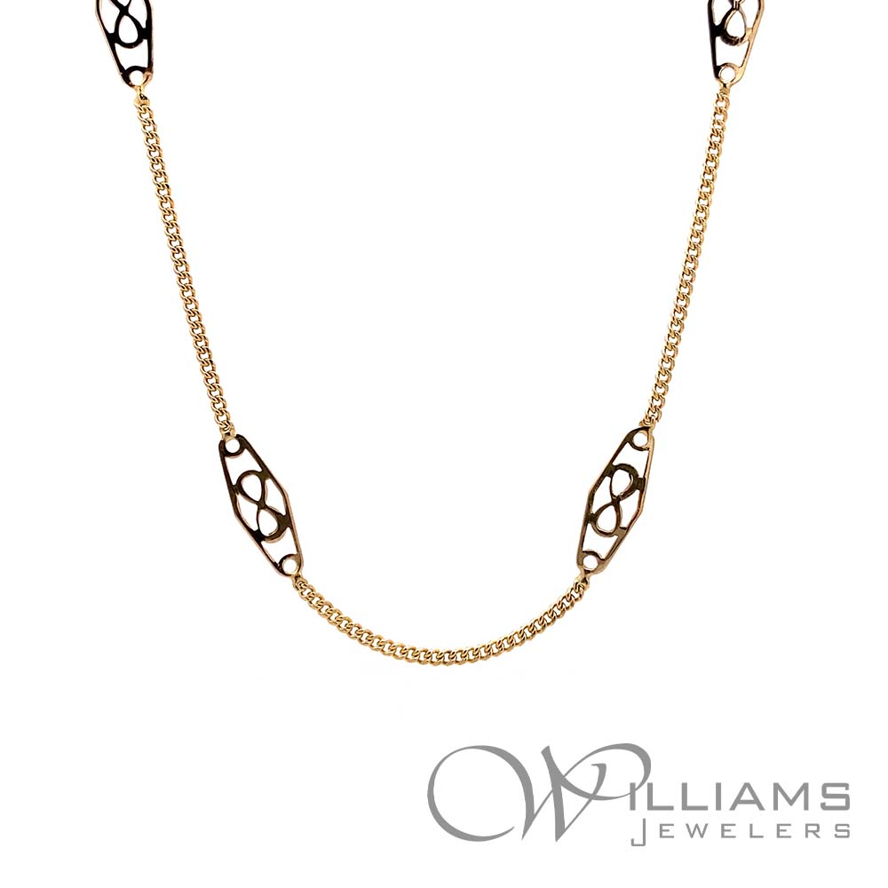 Estate 14 Karat Yellow Gold Filigree Link Station Chain, 30 inches in length