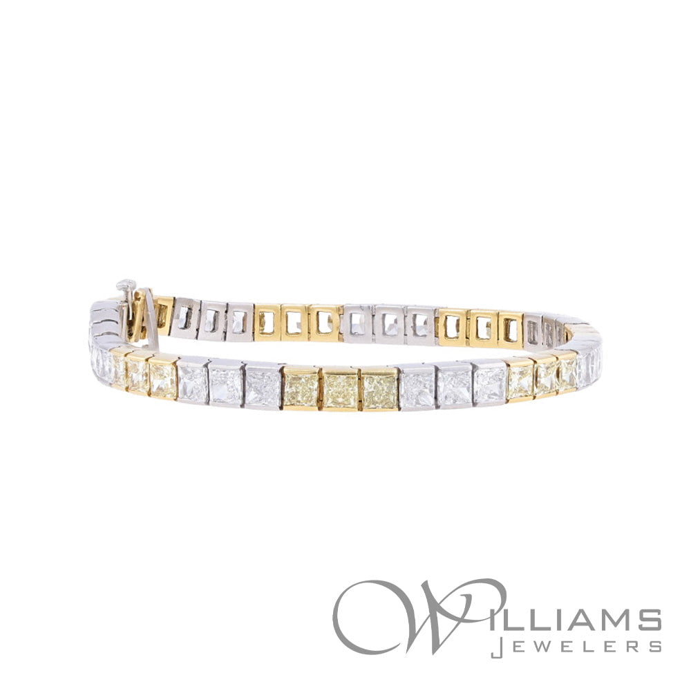 Estate Platinum and 18 Karat Yellow Gold Yellow and White Diamond Line Bracelet with 8.00 Carat Total Weight Radiant G-H Color, VSI-SI Clarity Diamonds and 7.00 Carat Total Weight Radiant Yellow Diamonds , 7.5+ inches in length