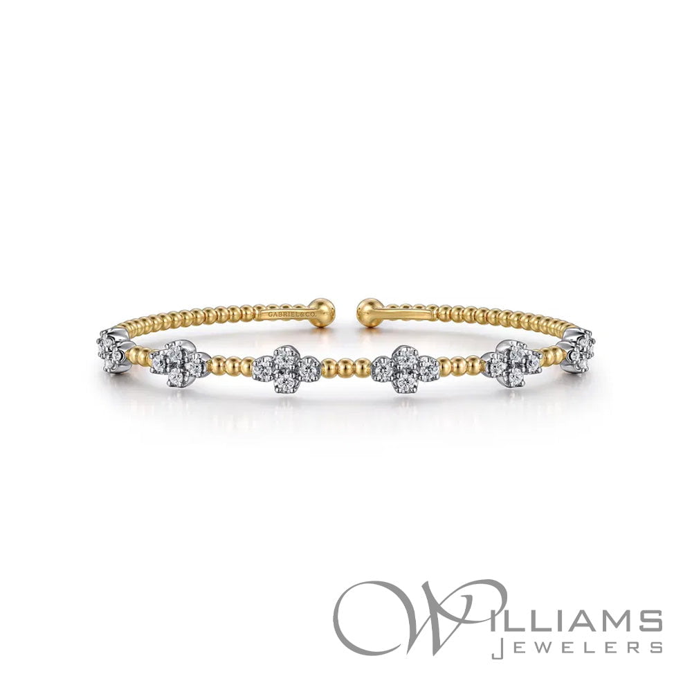 Gabriel & Co. 14 Karat White and Yellow Gold Bujukan Diamond Bangle with .73 Carat Total Weight Round J Color, SI2 Clarity Diamonds, Size 6. Serial# S2219224
