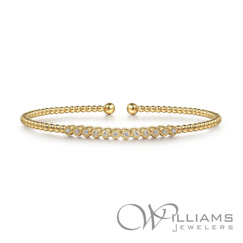 Gabriel & Co. 14 Karat Yellow Gold Bujukan Bead Diamond Bangle with .14 Carat Total Weight Round J Color, SI2 Clarity Diamonds, Size 6. Serial# S2199735