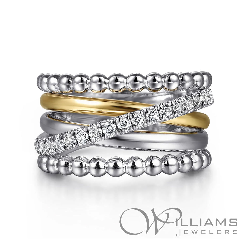 Gabriel & Co. Sterling Silver and 14 Karat Yellow Gold Bujukan White Sapphire Wide Band Ring with .46 Carat Total Weight Round Sapphires, Size 6.5. Serial# S2205166