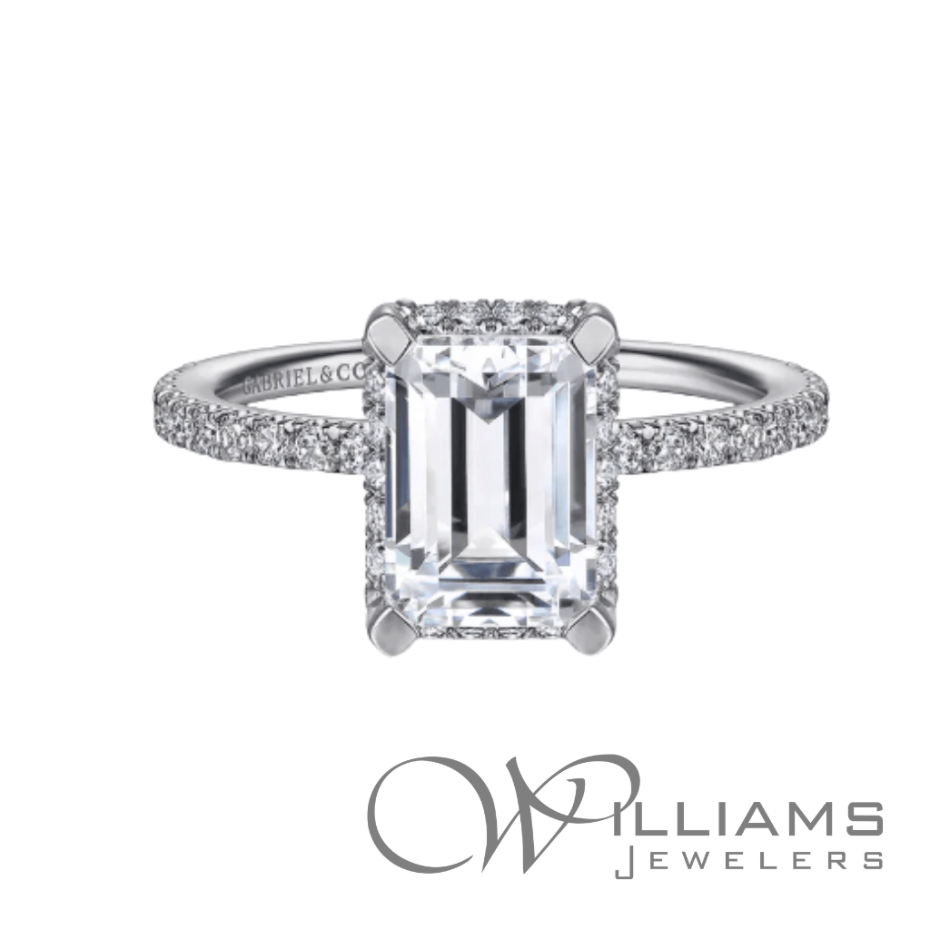 Gabriel & Co. 14 Karat White Gold Classic Hidden Halo Emerald Cut Diamond Semi-Mount Engagement Ring with .28 Carat Total Weight Round G-H Color, SI2 Clarity Diamonds and a center 6.5x5mm Emerald Cut Cubic Zirconia, Size 6.5, Serial # S1641724