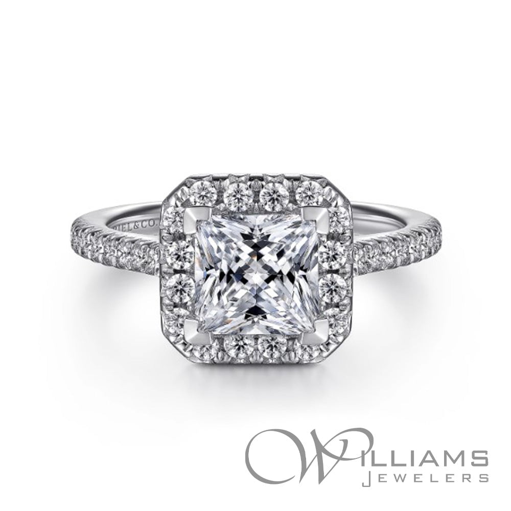 Gabriel & Co. 14 Karat White Gold Classic Princess Halo Diamond "Patience" Semi-Mount Engagement Ring with .38 Carat Total Weight Round G-H Color, SI2 Clarity Diamonds and a center 6mm (1.25 Carat) Princess Cut Cubic Zirconia, Size 6.5, Serial # S1641726