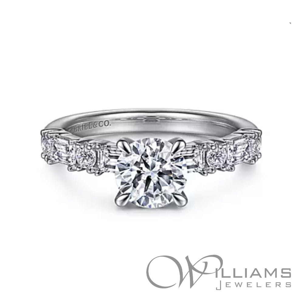 Gabriel & Co. 14 Karat White Gold Contemporary Diamond "Leanna" Semi-Mount Engagement Ring with .77 Carat Total Weight Baguette Cut and Round G-H Color, SI2 Clarity Diamonds and a center 6.5mm (1.00 Carat) Round Cubic Zirconia. Size 6.5, Serial # S1532920