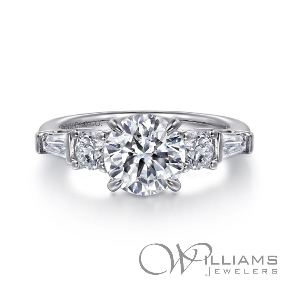 Gabriel & Co. 14 Karat White Gold Contemporary Round Five-Stone Diamond "Darmie" Semi-Mount Engagement Ring with 4=.63 Carat Total Weight Baguette Cut & Round G-H Color, SI2 Clarity Diamonds with a center 7.4mm (1.50 Carat) Round Cubic Zirconia. Size 6.5, Serial # S1641708