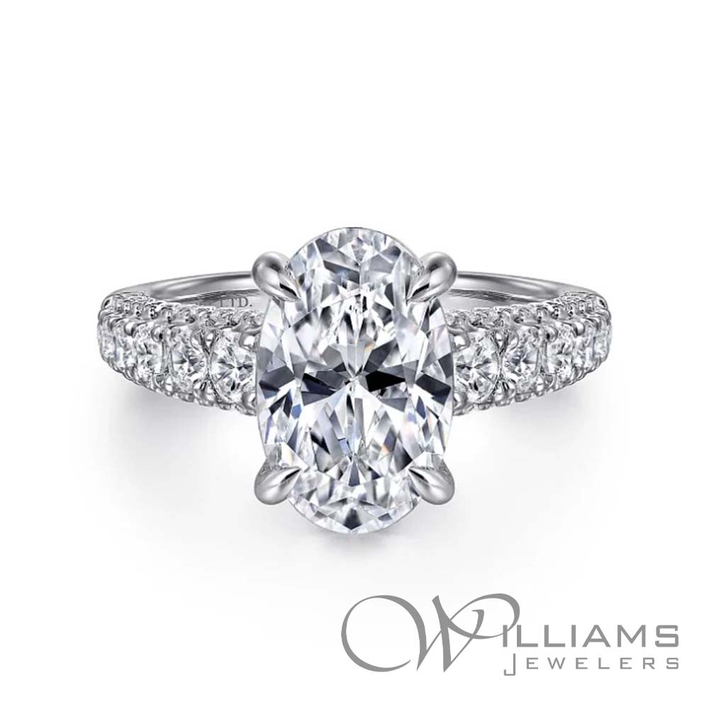 Gabriel & Co. 18 Karat White Gold Contemporary Oval Cut Diamond "Andais" Semi Mount Engagement Ring with .90 Carat Total Weight Round G-H Color, VS2 Clarity Diamonds (GIA Cert) and a center 11.5x7.5mm Oval Cut Cubic Zirconia, Size 6.5, Serial # S1708365