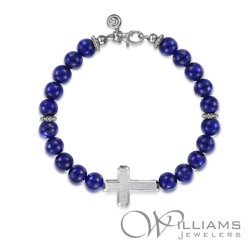 Gabriel & Co. Sterling Silver Bujukan 8mm Lapis Beaded Cross Bracelet. Size 8.5, Serial # S2027780