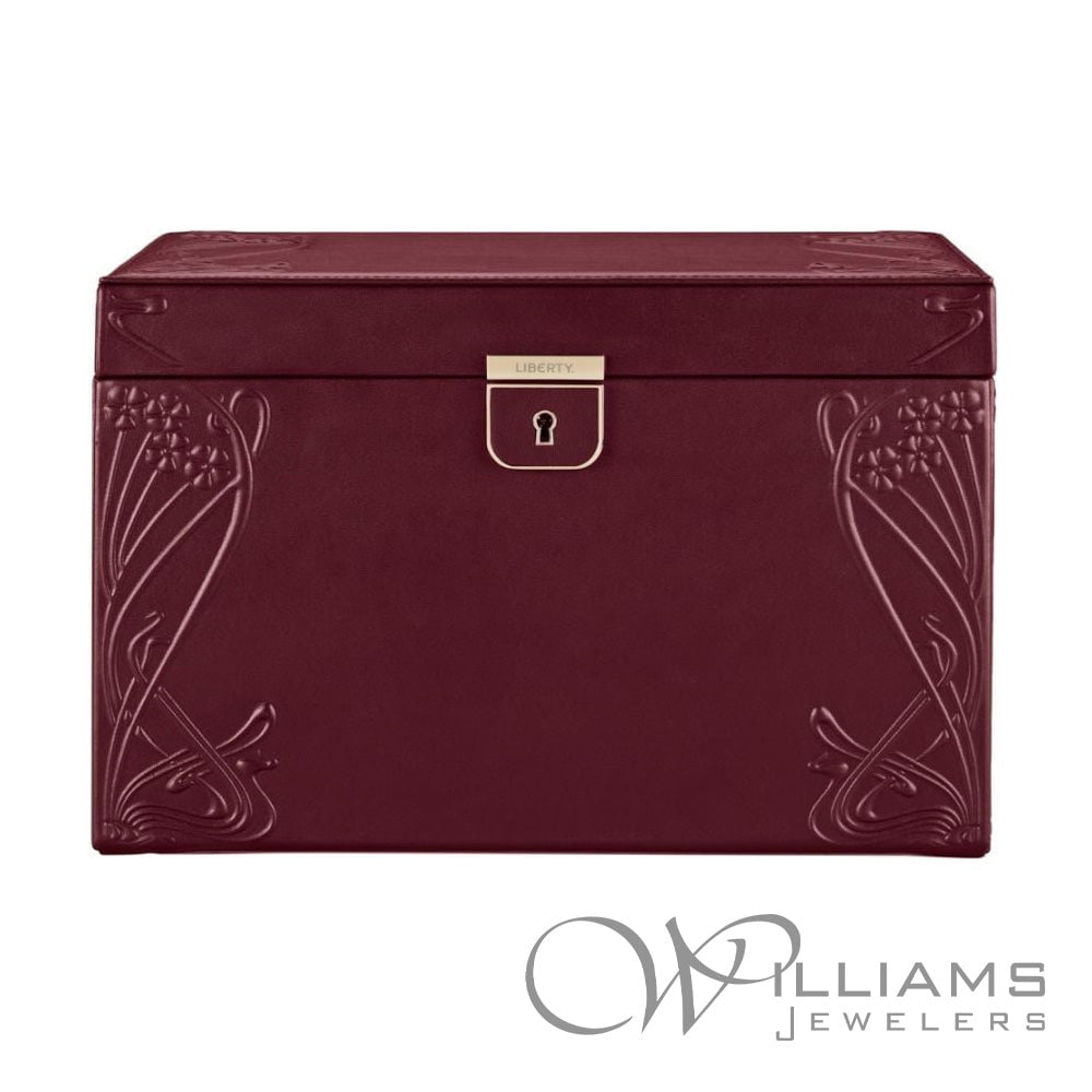 Wolf x Liberty Large Jewellery Box in Burgundy with 15 Storage Compartments, 3 Ring Rolls, 2 Watch Cushions, and Mirror. 11.75" L x 8.75" W x 7.5" H