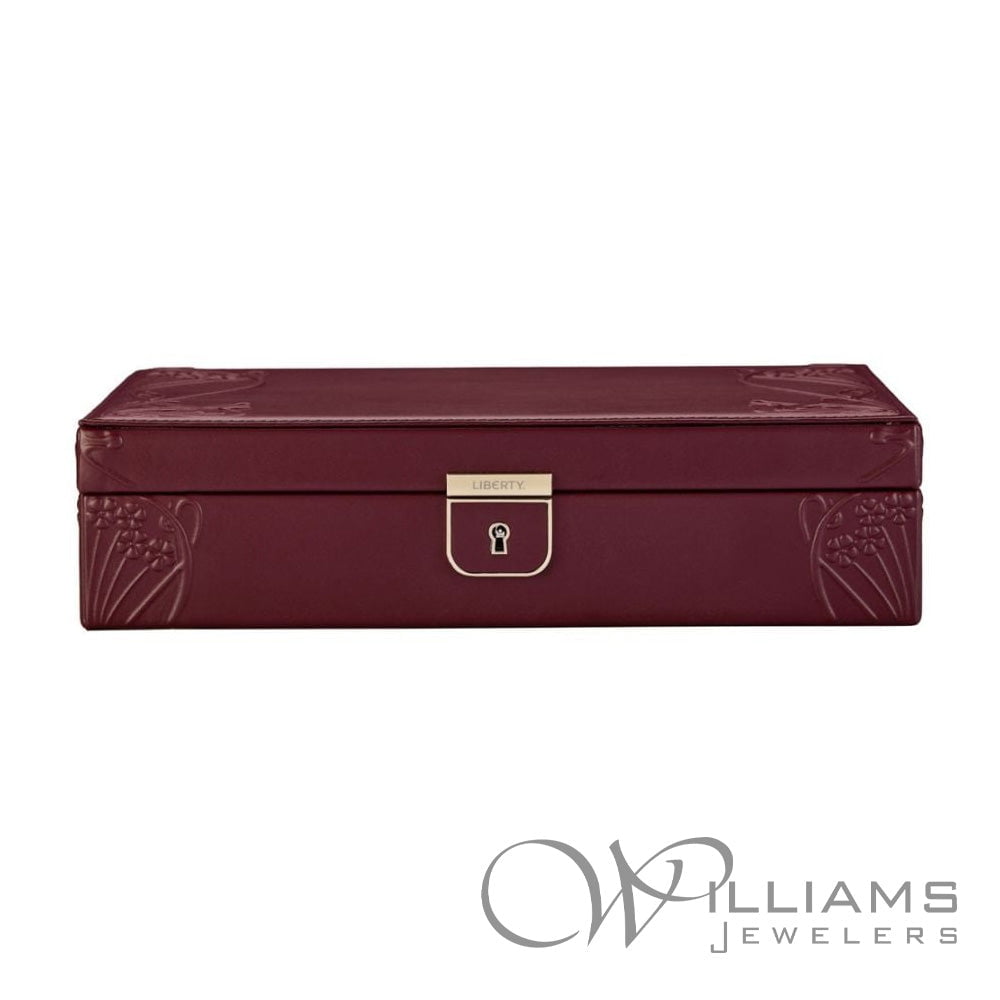 Wolf x Liberty Medium Jewellery Box in Burgundy with 4 Ring Rolls, 6 Storage Sections, and Mirror. 12" L x 8.5" W x 3" H