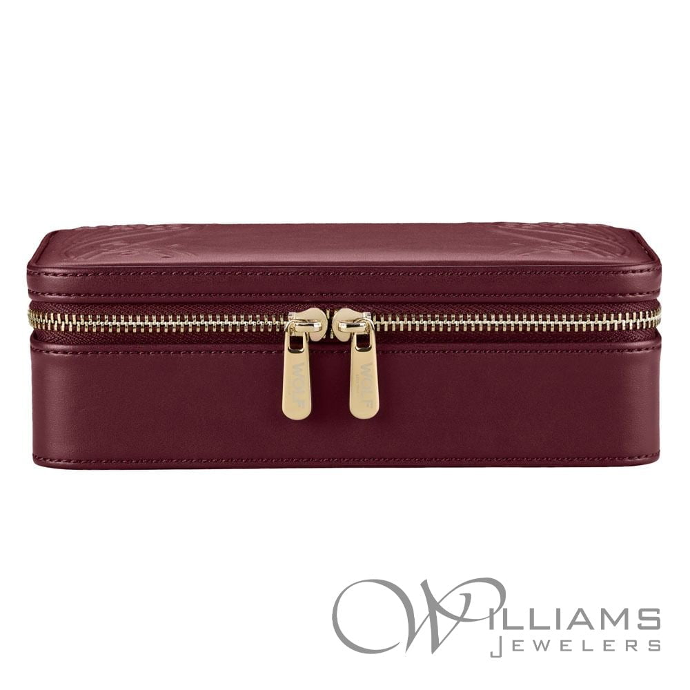 Wolf x Liberty Medium Jewellery Zip Case in Burgundy with Earring Tab, Ring Tab, Internal Zip Pouch, Removable Zip Pouch, Snap-on Necklace Holders. 8.25" L x 5.5" W x 2.75" H