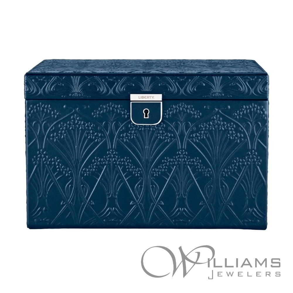 Wolf x Liberty Large Jewelery Box in Navy with 15 Storage Compartments, 3 Ring Rolls, 2 Watch Cushions, and Mirror. 11.75" L x 8.75" W x 7.5" H