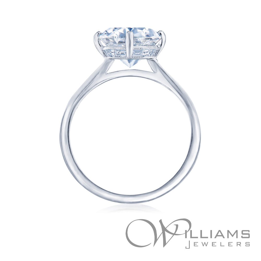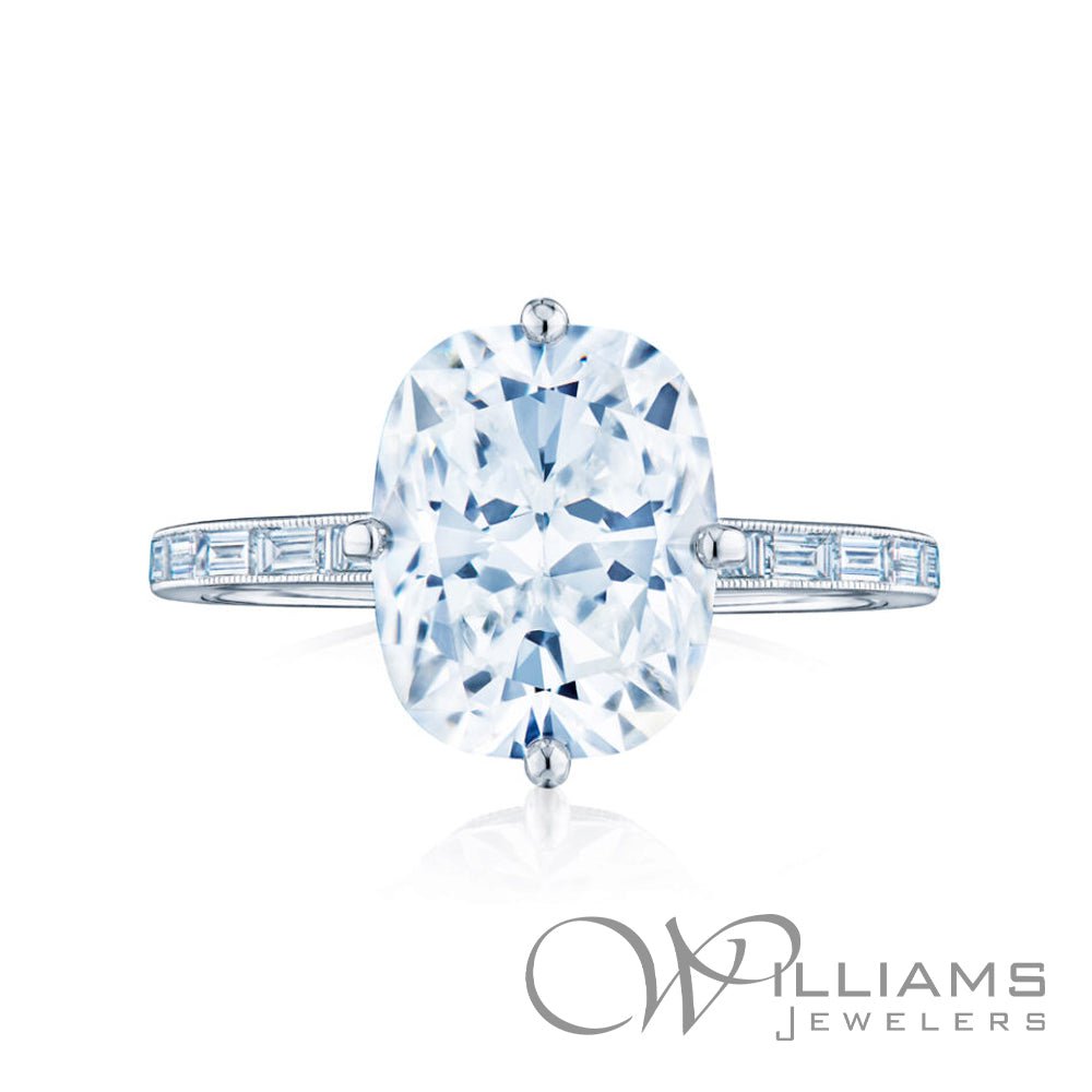 Kwiat Platinum Compass Set Cushion Diamond and Baguette Engagement Ring with a center 2.01 Carat Kwiat Cushion H Color, SI1 Clarity Diamond (GIA# 6502536950) and .38 Carat Total Weight Baguette G-H Color, VS1-SI1 Clarity Diamonds, Size 6
