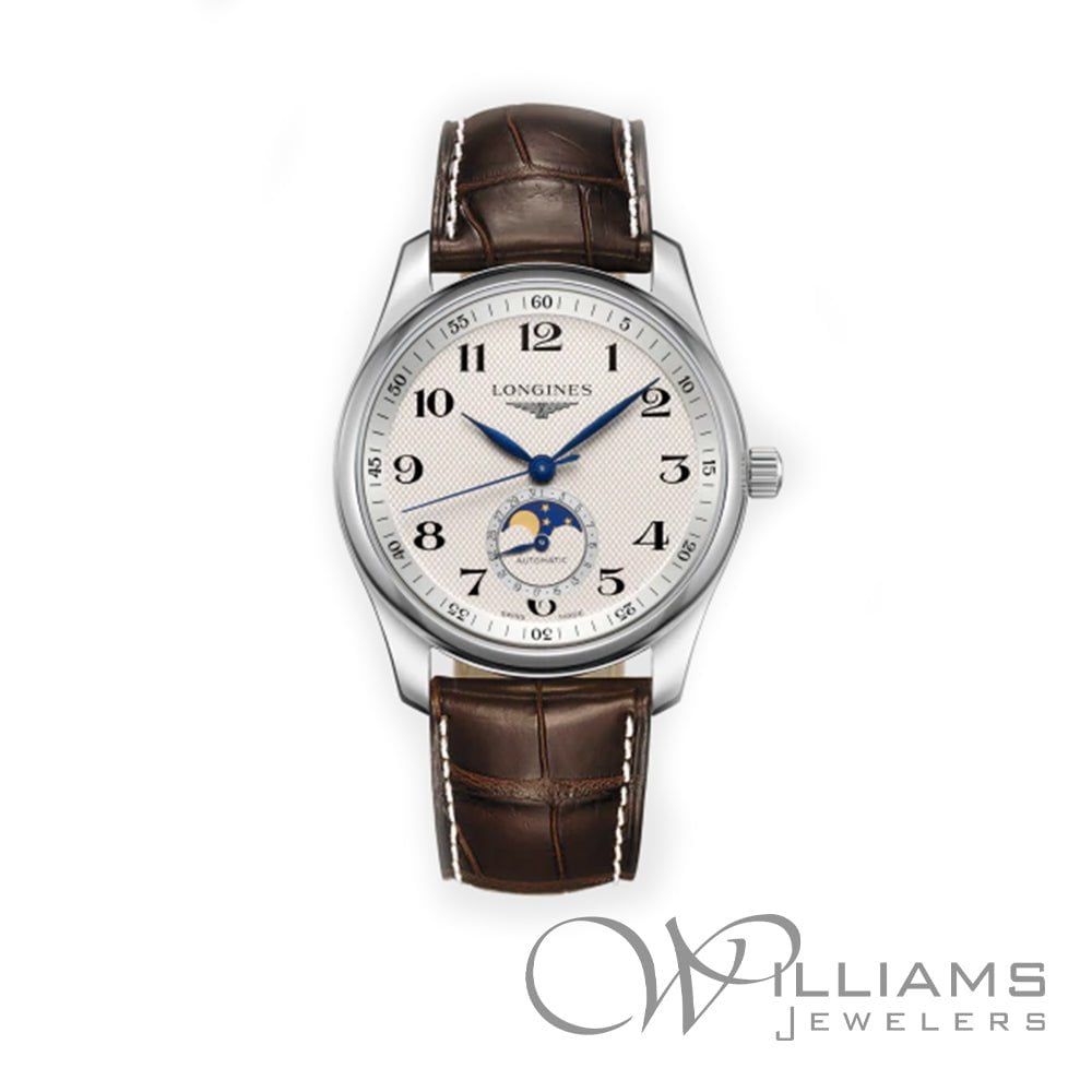 42mm Longines Stainless Steel Master Collection Automatic Moon Phase, Painted Arabic Dial, Blue Steel Hands, Sapphire Crystal, and Brown Alligator strap, Serial # 53967707