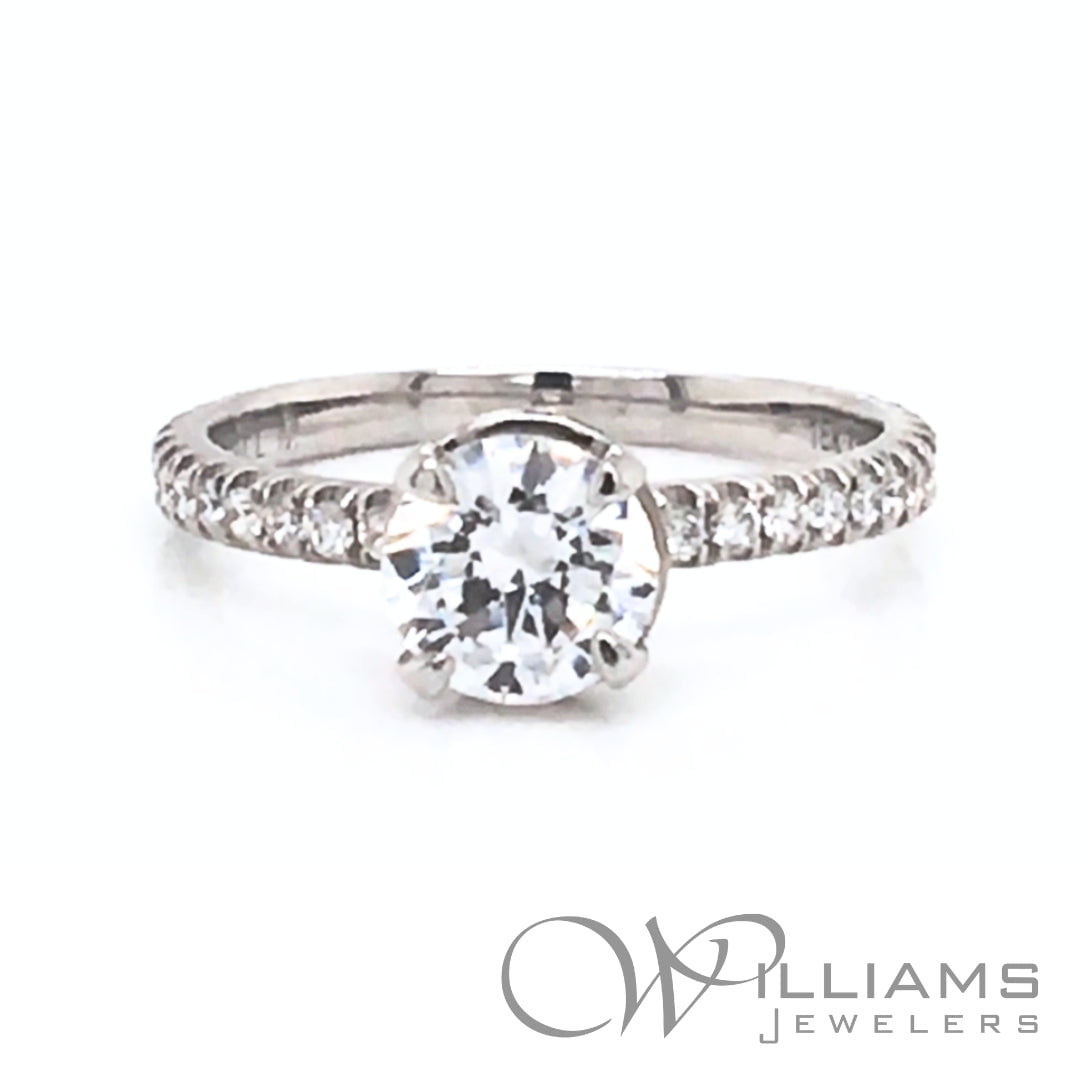 Michael M 18 Karat White Gold Crown Diamond Semi-Mount Ring with .29 Carat Total Weight Round Brilliant G Color, VS1 Clarity Diamonds and a center 6.5mm (1 Carat) Round Cubic Zirconia, Size 6