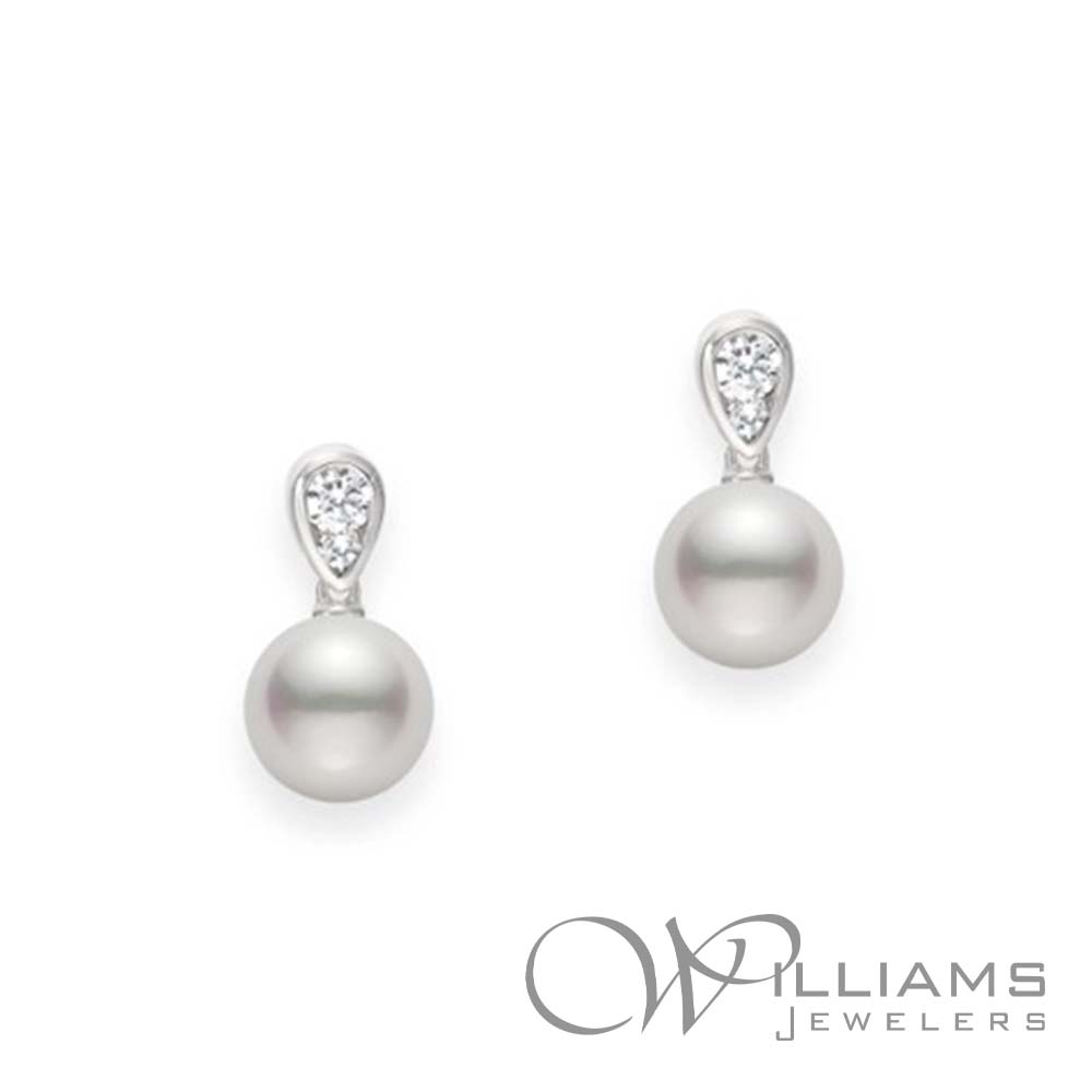 Mikimoto 18 Karat White Gold 7mm Akoya Cultured Pearl and Diamond Stud Earrings with 4=.18 Carat Total Weight Round G Color, VS Clarity Diamonds. (A+)