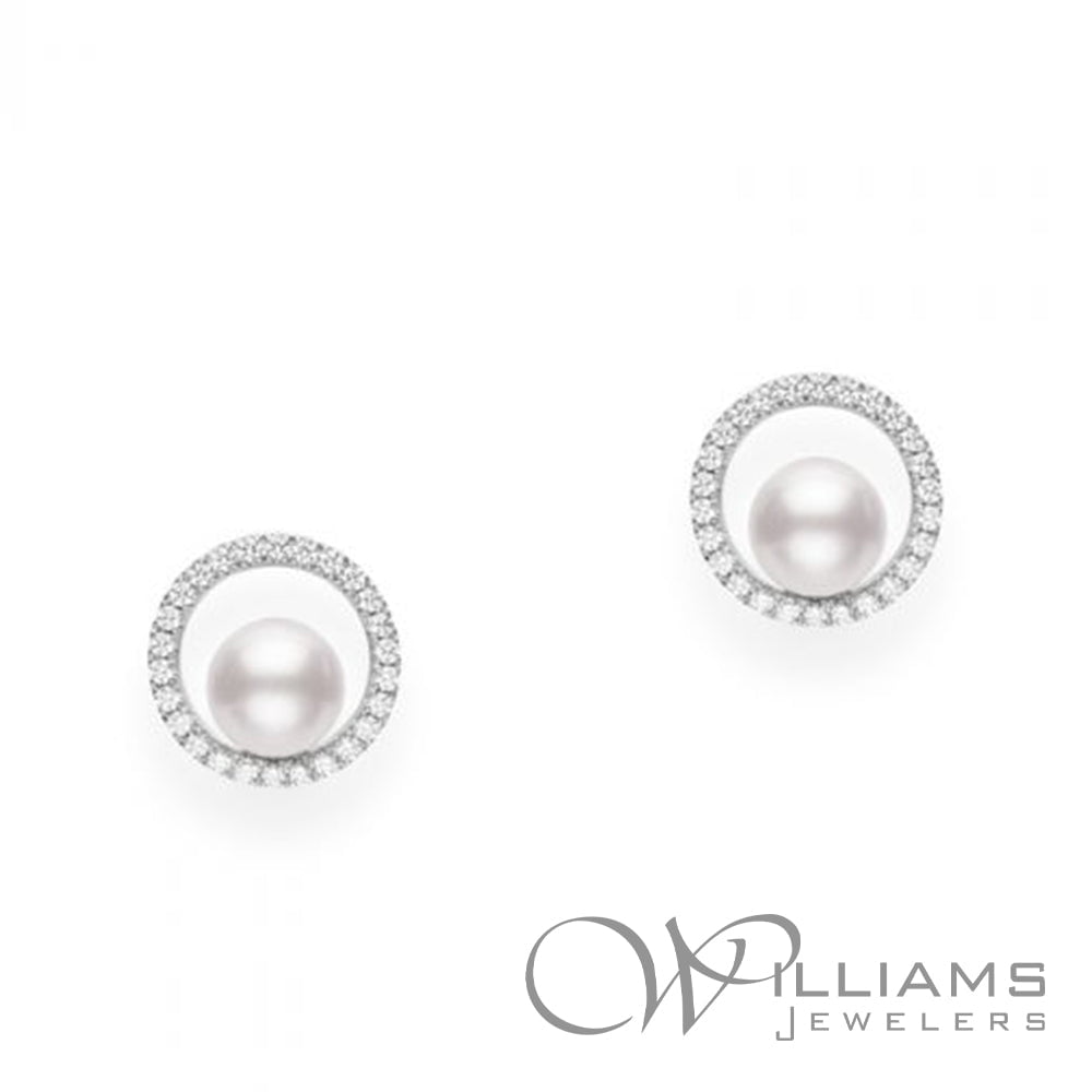 Mikimoto 18 Karat White Gold Classic Diamond Akoya 6mm Cultured Pearl Earring with 52= .26 Carat Total Weight Round G Color, VS Clarity Diamonds. A+