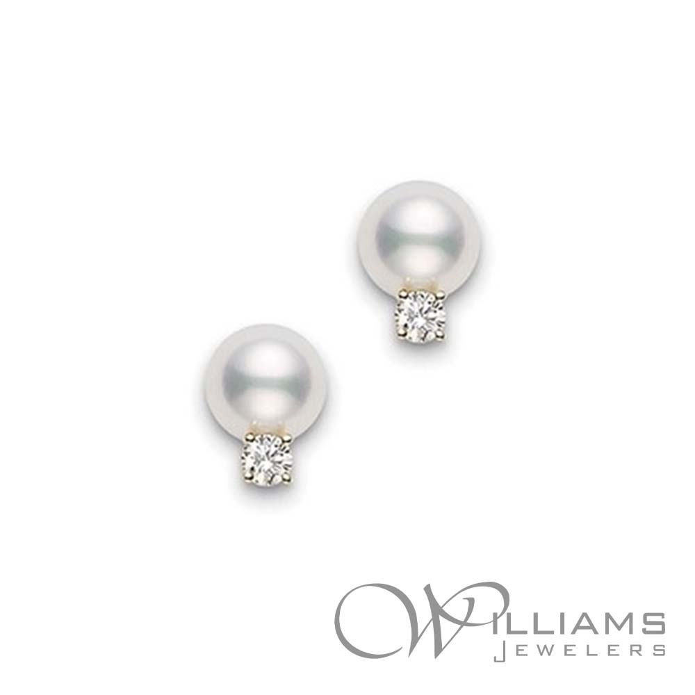 Mikimoto 18 Karat Yellow Gold 7-7.5mm Akoya Cultured Pearl and Diamond Stud Earrings with 2=.10 Carat Total Weight Round G Color, VS Clarity Diamonds. (A+)