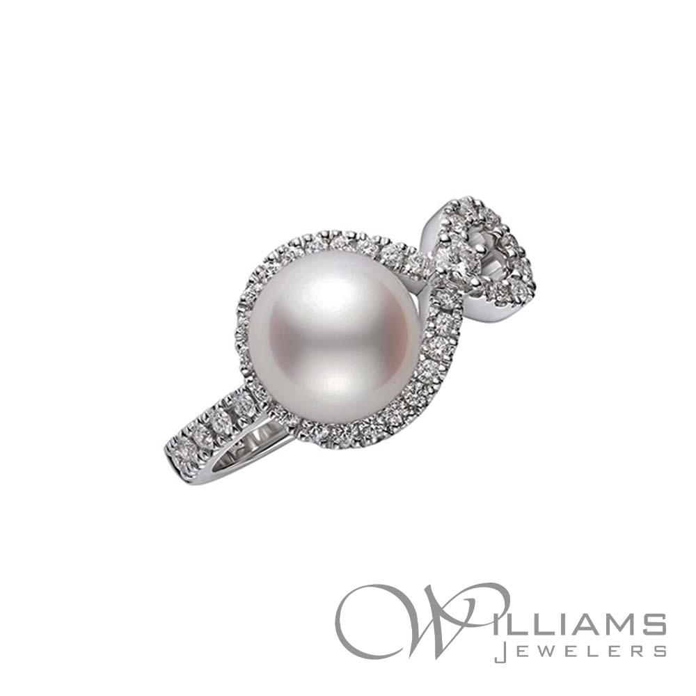 Mikimoto 18 Karat White Gold Cherish Ruyi Akoya Cultured Pearl and Diamond Ring with a 8mm Akoya Cultured Pearl and .20 Carat Total Weight Round G Color, VS Clarity Diamonds, Size 6.5 (A+)