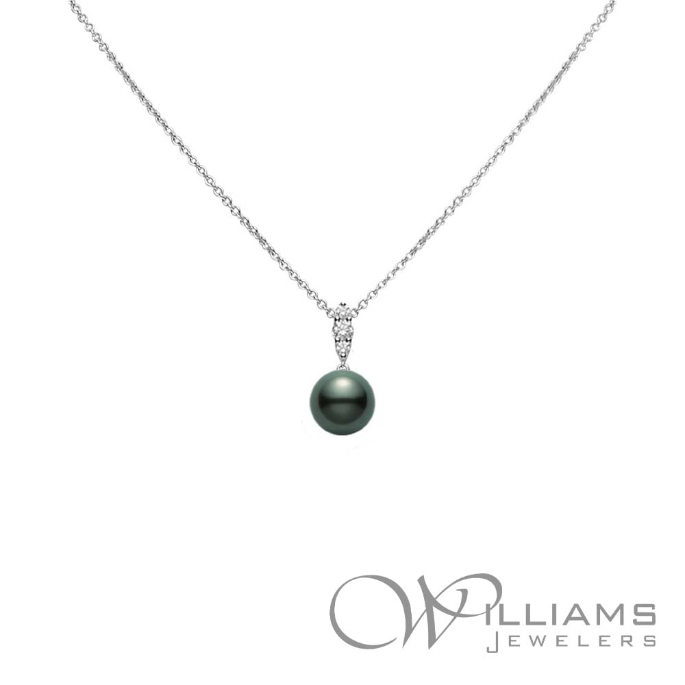 Mikimoto 18 Karat White Gold Morning Dew Black South Sea Cultured Pearl Pendant with a 9mm South Sea Cultured Pearl and .12 Carat Total Weight Round G Color, VS Clarity Diamonds (A+), 16 to 18 inches in length