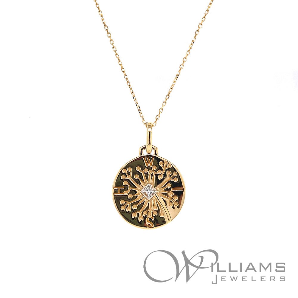 Monica Rich Kosann 18 Karat Yellow Gold Wish Dandelion Intaglio Princess Cut Diamond Round Charm with a .08 Carat Princess Cut F-G Color, VS2 Clarity Diamond. 16-17 Inch Adjustable Diamond-Cut Disappearing Chain