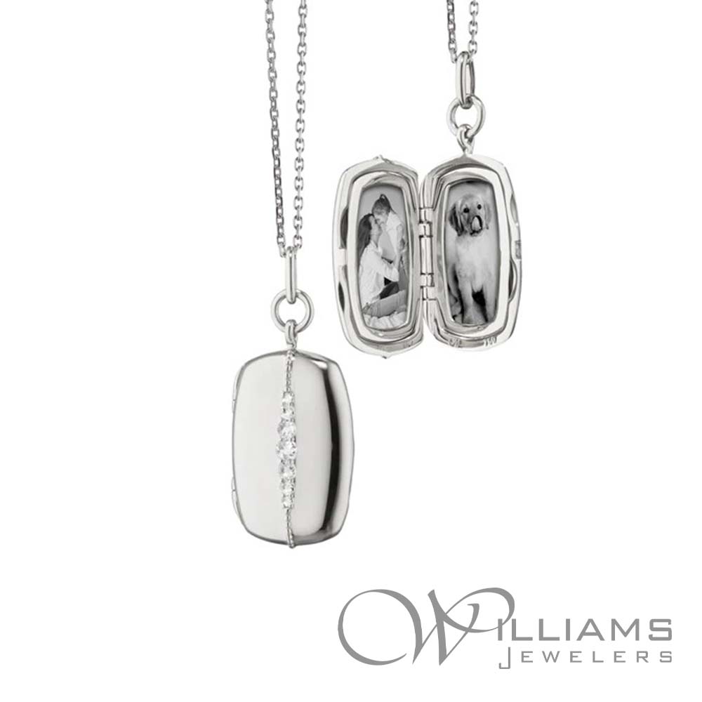 Monica Rich Kosann Sterling Silver Slim White Sapphire Rectangular Locket with .06 Carat Total Weight Round White Sapphires. 16-18 Inch Adjustable Chain