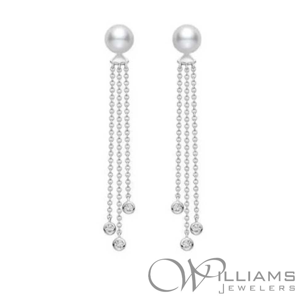 Mikimoto 18 Karat White Gold 7.5mm Cultured Akoya Pearl Drop Diamond Earrings with 6=.21 Carat Total Weight Round G Color, VS Clarity Diamonds. (A+)