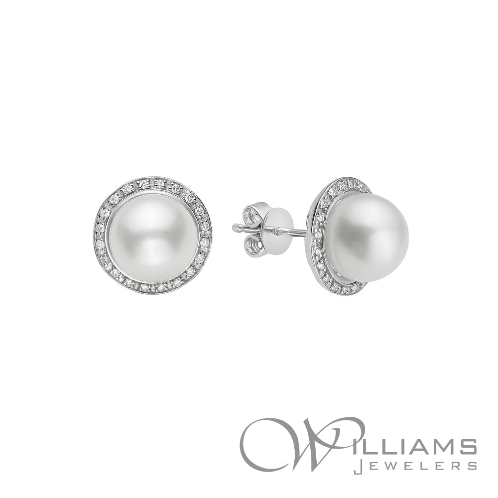 Williams Signature 14 Karat White Gold Freshwater Pearl and Diamond Earrings with 2=8-9mm Cultured Freshwater Pearls and 40=.10 Carat Total Weight Round G Color, VS Clarity Diamonds