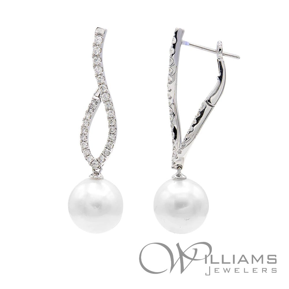 Williams Signature 18 Karat White Gold White South Sea Pearl and Round Diamond Earrings with 2=10-11mm South Sea Pearls and .70 Carat Total Weight Round G Color, VS2 Clarity Diamonds