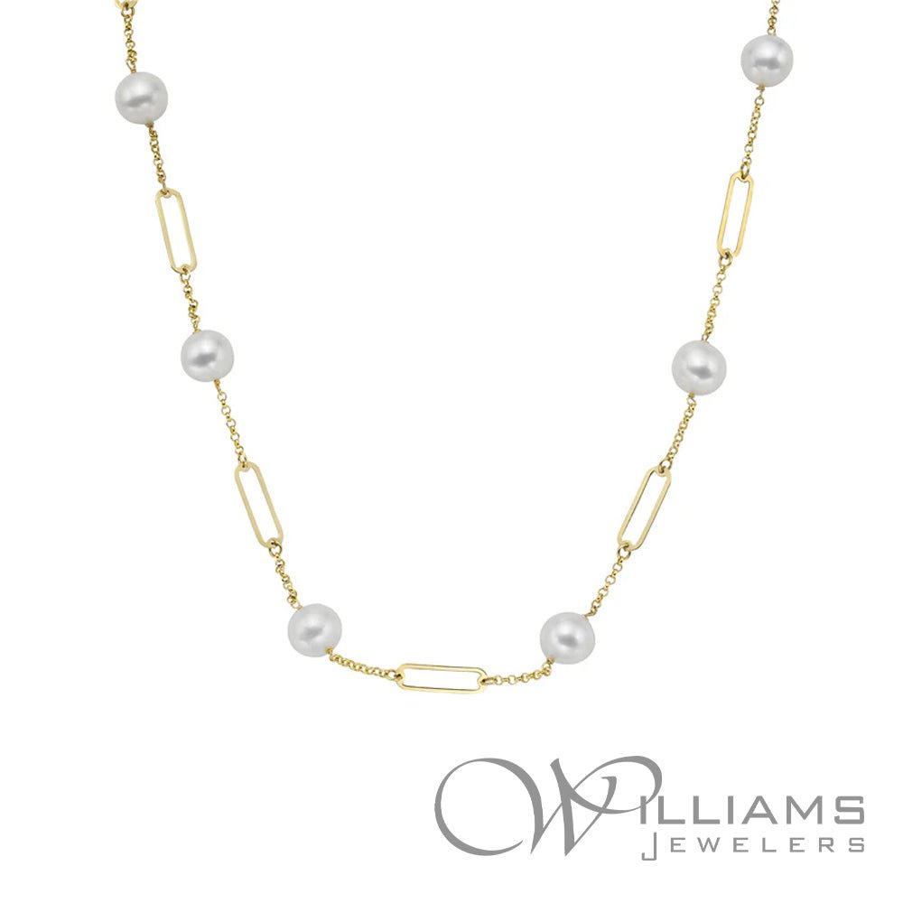 Williams Signature 14 Karat Yellow Gold Tin Cup White Freshwater Pearl Necklace with 6=9-10mm Freshwater Pearls, 20 inches in length