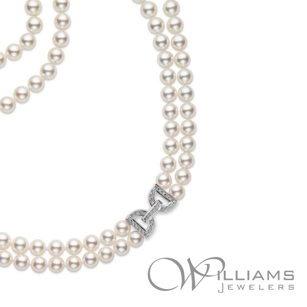 Mikimoto 18 Karat White Gold 7x6.5mm Akoya Cultured Pearl Double Diamond Necklace with 30=.35 Carat Total Weight Round G Color, VS Clarity Diamonds. 17.5 Inches in Length (A+)