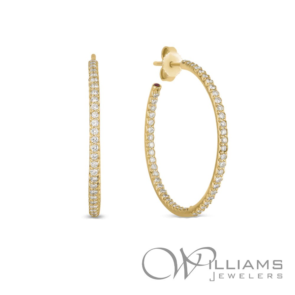 Roberto Coin 18 Karat Yellow Gold Perfect Diamond Inside Outside Hoop Earrings with .98 Carat Total Weight Round G-H Color, SI Clarity Diamonds.