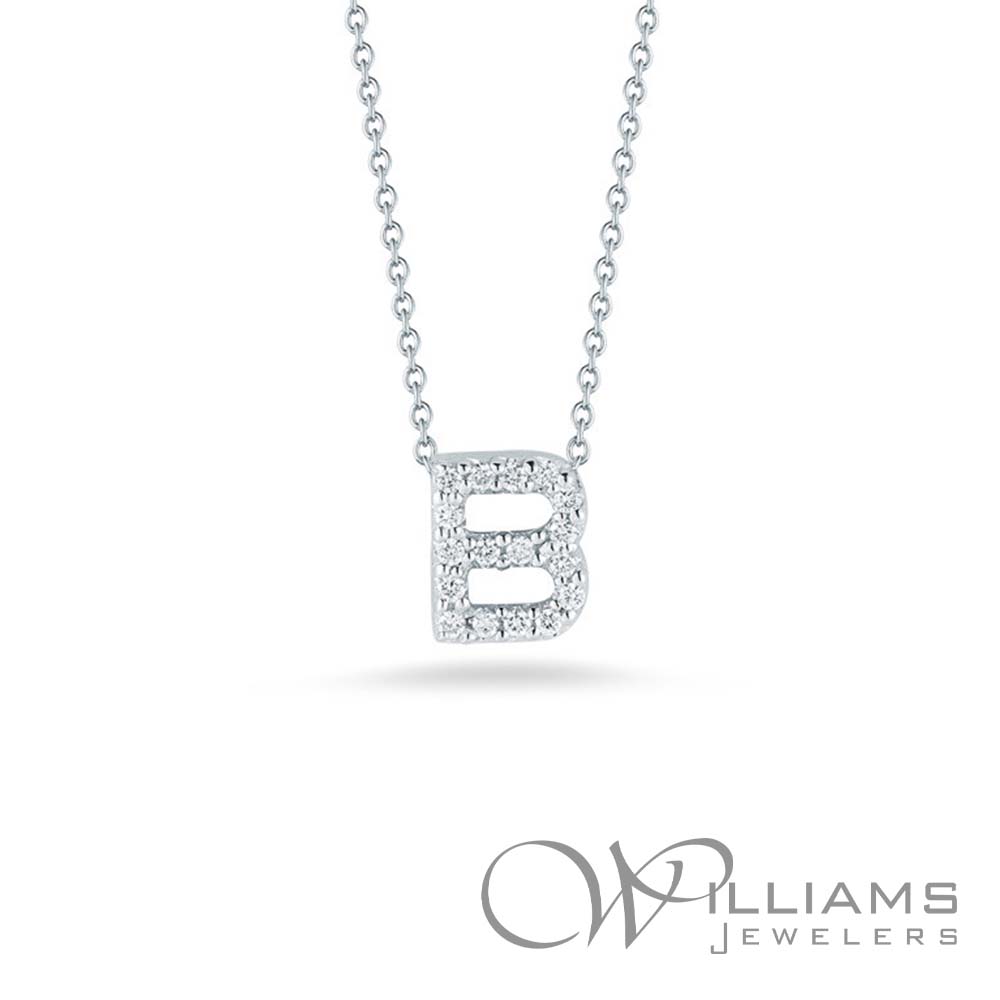 Roberto Coin 18 Karat White Gold Tiny Treasures Love Letter Diamond "B" Pendant Necklace with .06 Carat Total Weight Round G-H Color, SI Clarity Diamonds, 16-18 Inch Adjustable Chain