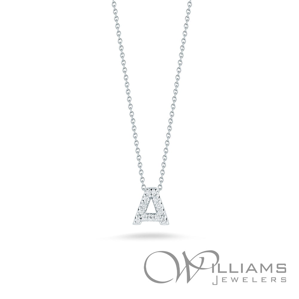 Roberto Coin 18 Karat White Gold Tiny Treasures Love Letter Diamond "A" Necklace with .06 Carat Total Weight Round G-H Color, SI Clarity Diamonds, 16-18 Inch Chain.