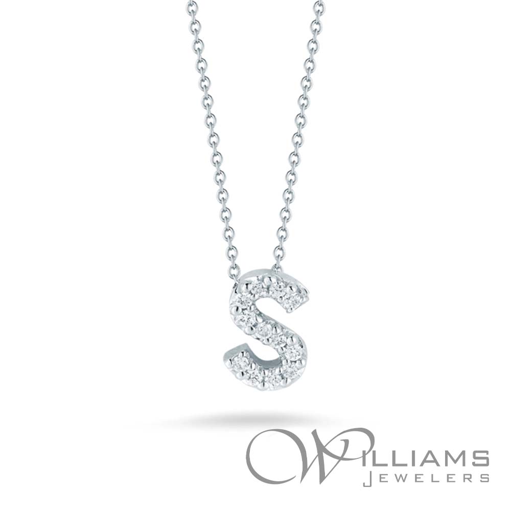 Roberto Coin 18 Karat White Gold Tiny Treasures Love Letter Diamond "S" Pendant Necklace with .05 Carat Total Weight Round G-H Color, SI Clarity Diamonds, 16-18 Inch Adjustable Chain