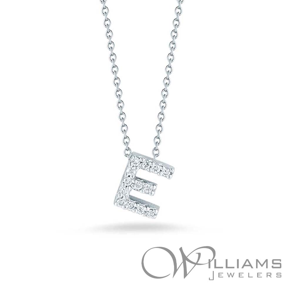 Roberto Coin 18 Karat White Gold Tiny Treasures Love Letter Diamond "E" Pendant Necklace with .06 Carat Total Weight Round G-H Color, SI Clarity Diamonds, 16-18 Inch Adjustable Chain