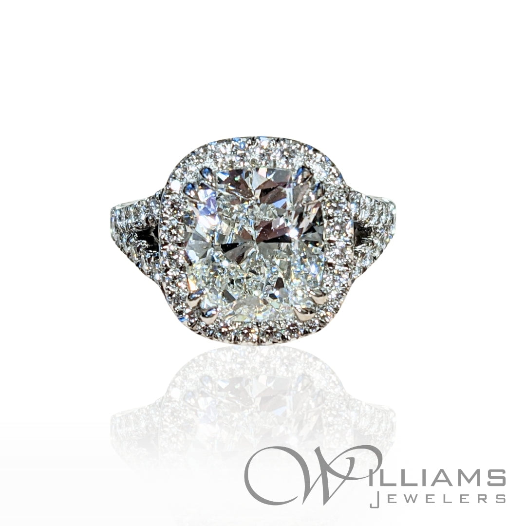 Williams Couture Platinum Diamond Halo Ring with a Center 5.02 Carat Cushion Diamond, H Color, IF (Internally Flawless) Clarity, GIA Report # 14274139, and 1.05 Carat Total Weight Round Brilliant Cut Side Diamonds, H Color, VS Clarity,