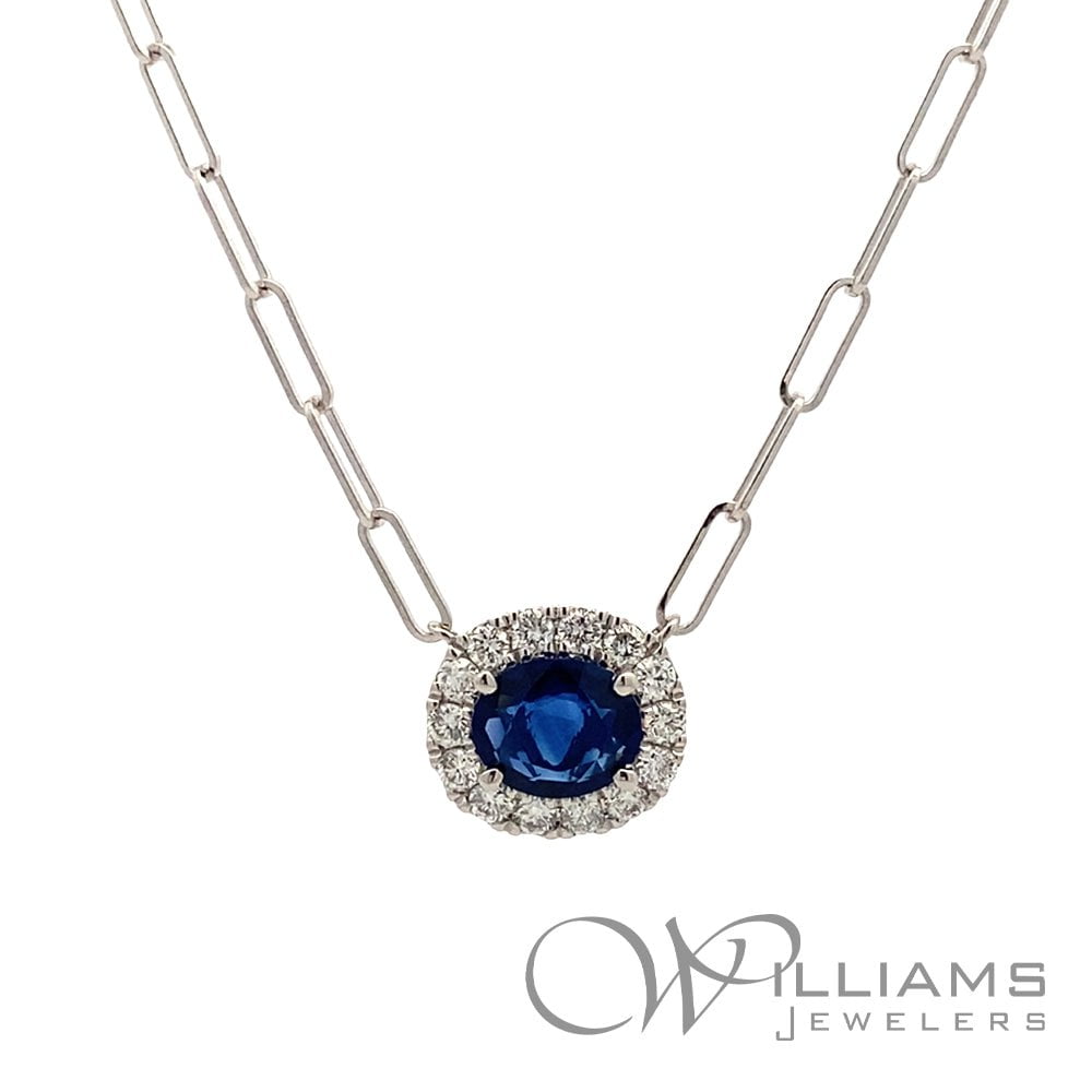 Williams Signature 14 Karat White Gold Blue Sapphire and Diamond Necklace with a 1.20 Carat Oval Sapphire and 14=.36 Carat Total Weight Round H Color, SI1 Clarity Diamonds, 16 inches in length